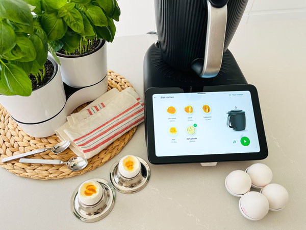 Kook tot 6 eieren in een liter water. Selecteer de gewenste hardheidsgraad: zacht, medium zacht, medium hard en hard. De Thermomix® stelt automatisch de gewenste tijd in.